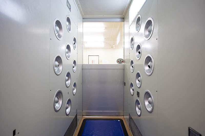 新工場はソフト面の管理はもちろん、レースや導入機材などはすべてステンレスおよびアルミを使用しています。室内高も従来より高く、ソックダクトを導入し、年間を通して10℃を保持。全作業工程ごとの温度管理を記録するなど、細部に渡って衛生管理を徹底するための設備環境を整えています。